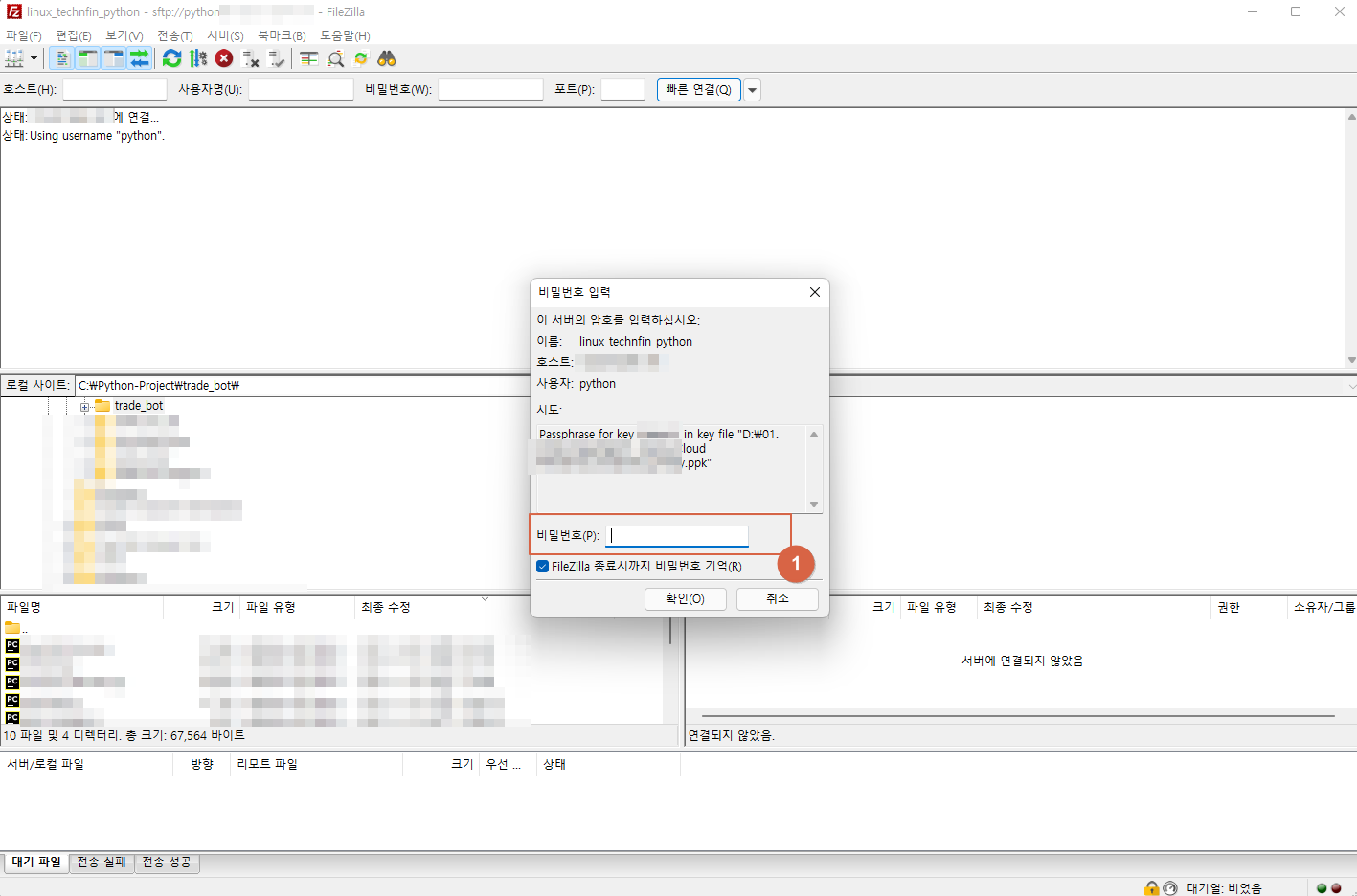 접속 시도를 하게 되면 키 파일의 암호를 묻게 되는데 설정한 암호를 입력하면 됩니다.