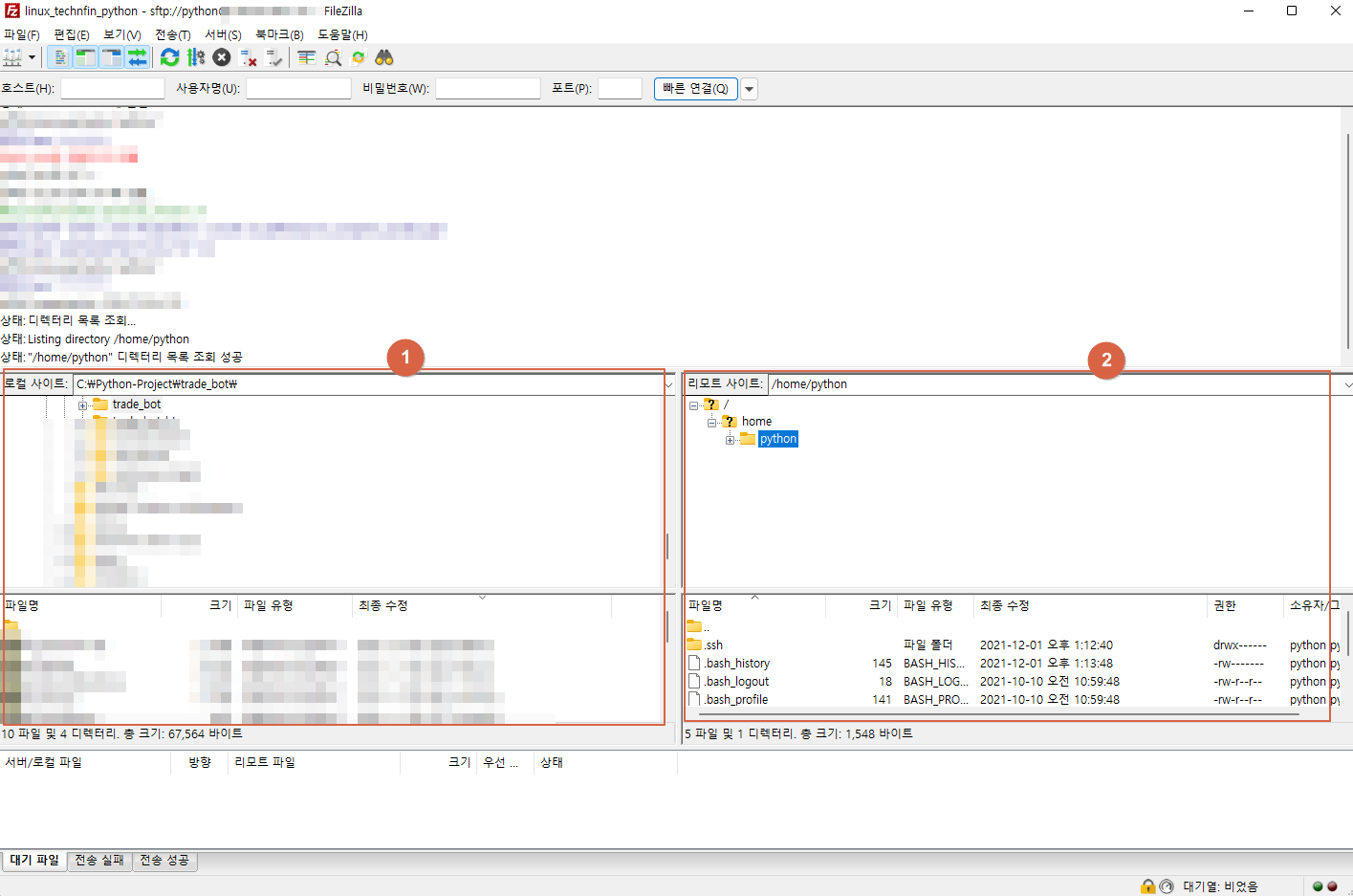접속이 완료 되면 ① 로컬 사이트 : 본인 PC 및 ② 리모트 사이트 : 접속한 서버가 표시 됩니다.