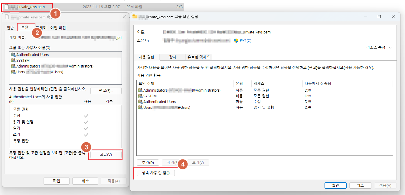 ① Private Key 파일을 탐색기로 찾아가서 우클릭 한 후 속성을 클릭하여 나오는 창에서