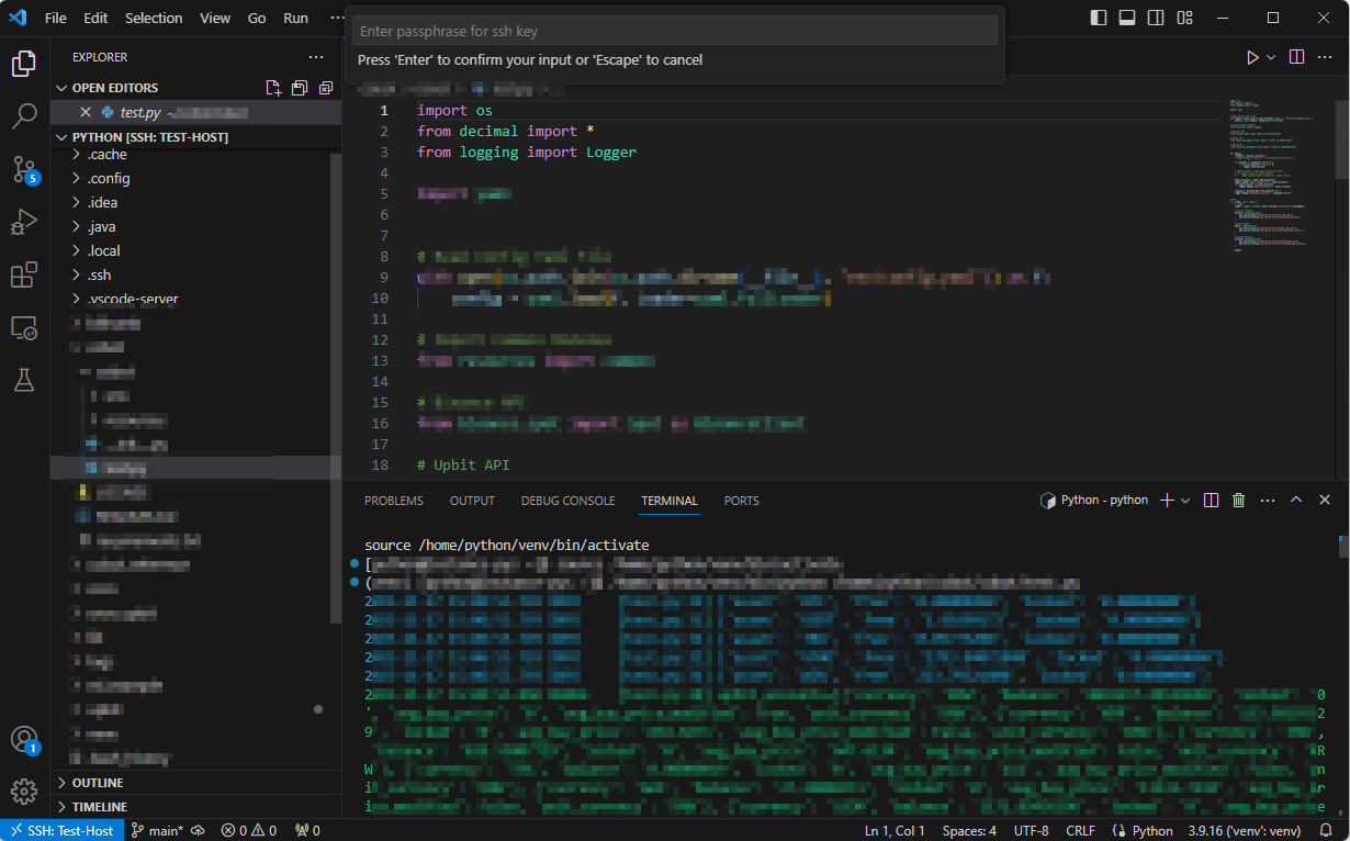 서버에서 작업하고자 하는 폴더를 선택하면 passphrase를 한번 더 물어보고 입력하면 위와 같이 서버의 파일을 직접 컨트롤 할 수 있게 됩니다. 또한 파일을 실행하게 되면 로컬 환경이 아닌 서버에서 실행됩니다. 즉 서버의 IP를 가지고 실행되는 것이기 때문에 API Key 같은 경우도 서버의 것을 이용하면 됩니다.