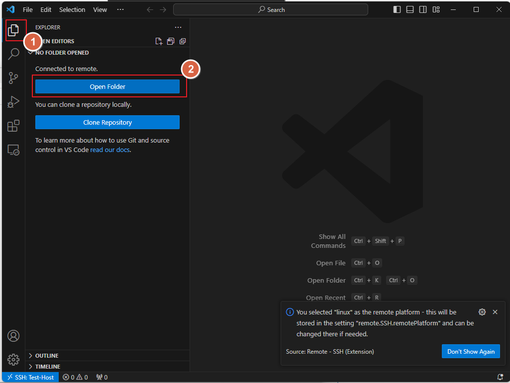 ① Explorer를 선택한 후 ② Open Folder를 클릭합니다.
