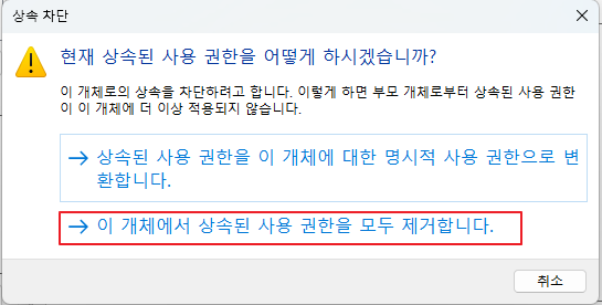 "이 개체에서 상속된 사용 권한을 모두 제거합니다." 를 클릭합니다.
