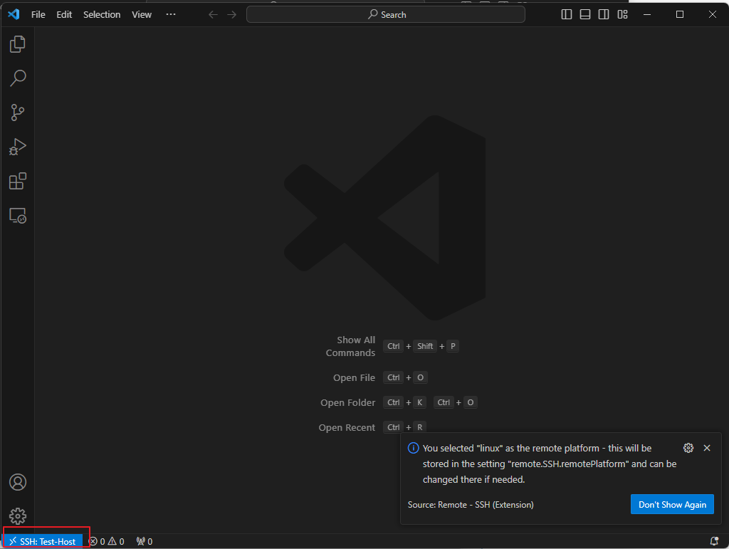 왼쪽 하단에 "SSH: 호스트명"이 보이고 원격 접속이 완료 되었습니다.